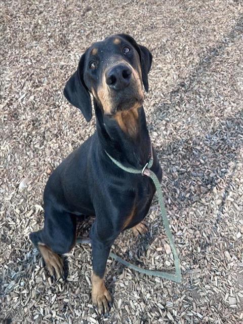 Description: My name is Tesla and I am a spayed female, black and brown Doberman Pinscher mix.