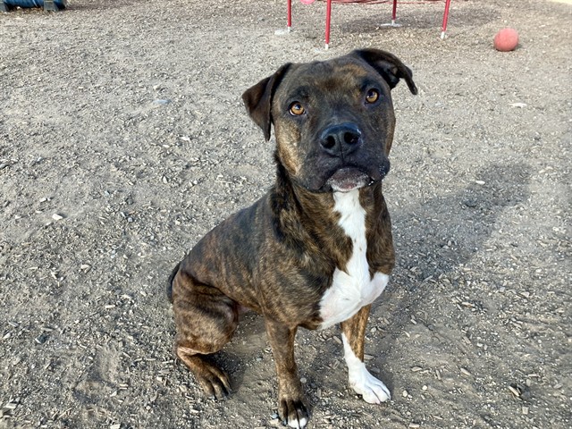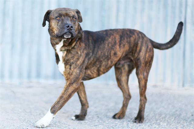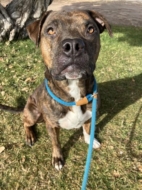 Description: Shelter staff named me Duke and I am a neutered male, brown brindle and blue American Pit Bull Terrier mix.