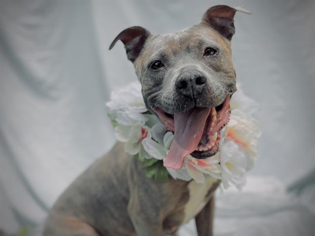 I appear to be a spayed female, brown brindle Pit Bull Terrier.