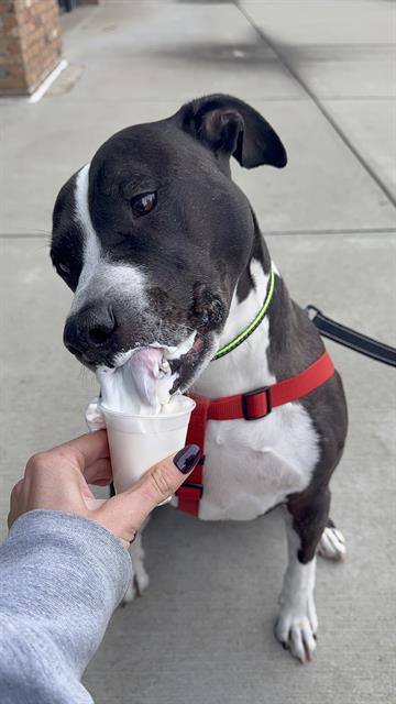 I appear to be a neutered male, black and white Pit Bull Terrier and Greyhound.