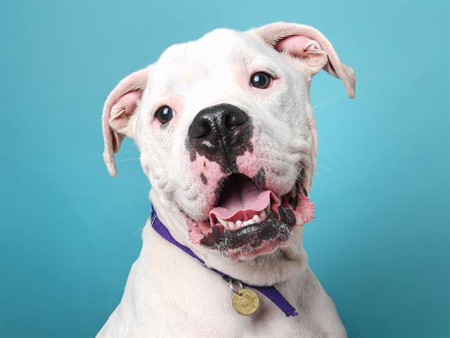I am a neutered male, white Pit Bull Terrier.