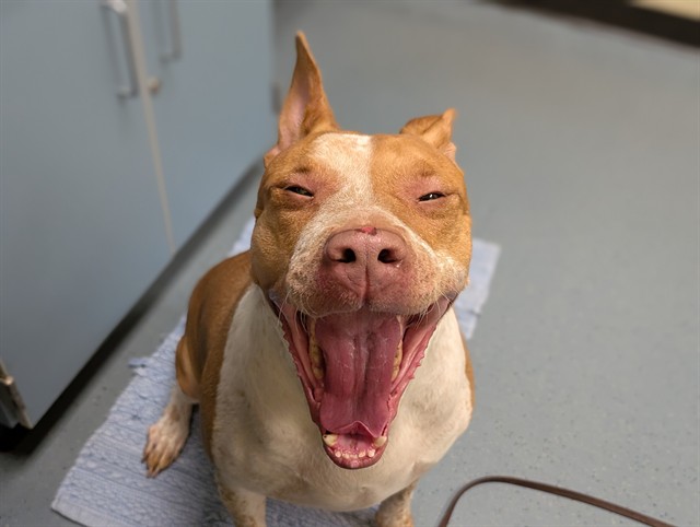 I am a spayed female, tan and white American Pit Bull Terrier mix