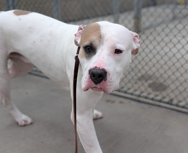 I am a male, white and tan Pit Bull Terrier
