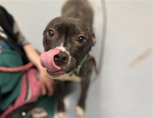 I am a female, brown brindle and white Pit Bull TerrierLILY is on our website but will be in surgery on 04/15/2026. LILY will not be available for public visits on the surgery day.