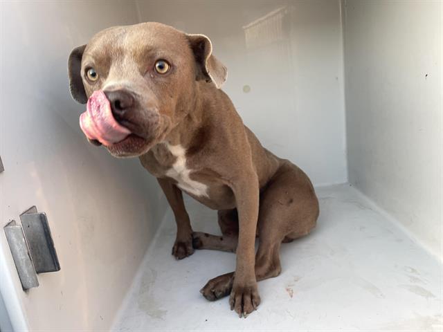 Description: I am male. I look like a brown and white Pit Bull Terrier.