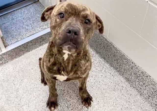 I am a neutered male. I look like a brown brindle and black Pit Bull Terrier.