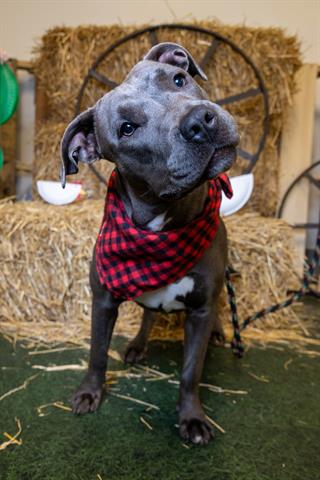 I am a spayed female. I look like a gray and white Pit Bull Terrier.