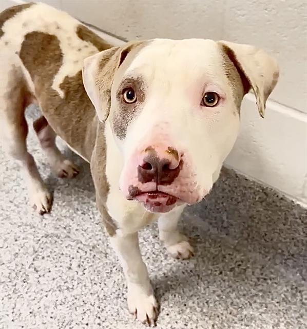 I am male. I look like a white and brown Pit Bull Terrier mix.