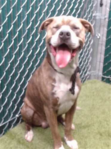 I am described as a neutered male, brown brindle and white Pit Bull Terrier.