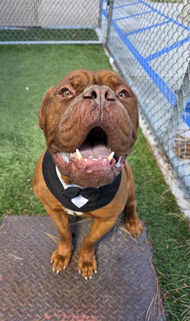 I am described as a male, tan and white Dogue de Bordeaux mix.