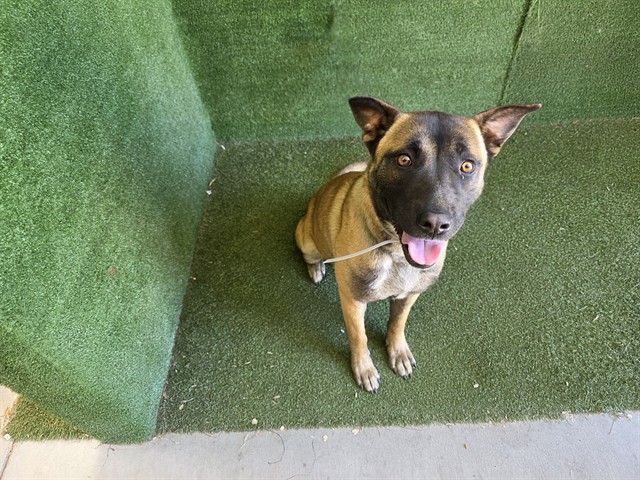 I am described as a female, tan and black Belgian Malinois mix.