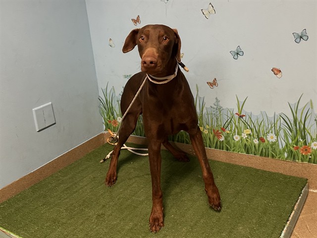 I am described as a male, brown Doberman Pinscher.