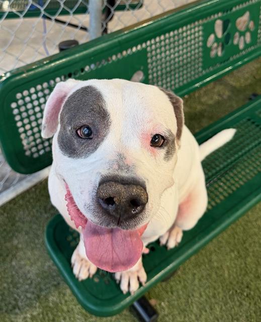 Description: I am a spayed female, white and blue American Bulldog.