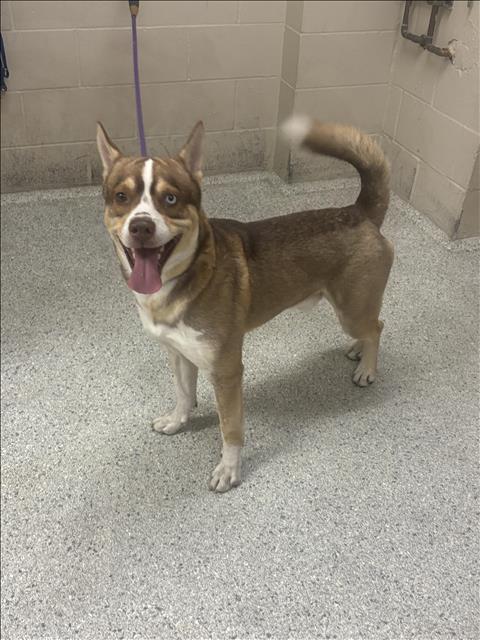 Description: I am a neutered male, brown and white Akita mix.