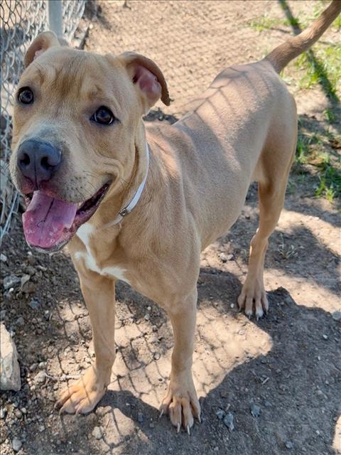 Description: I am a neutered male, tan and white Pit Bull Terrier.