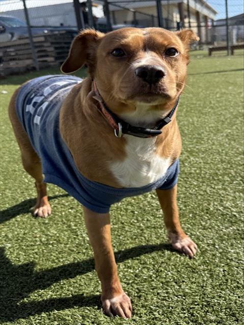 I am a neutered male, brown and white Beagle mix.