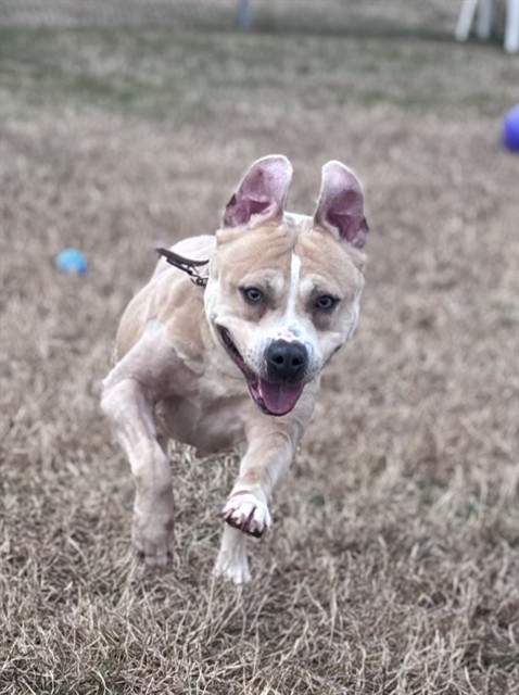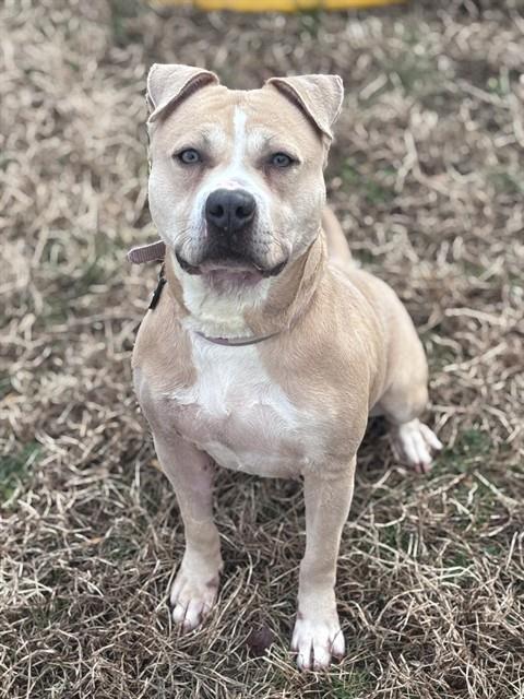 I am an unaltered female, tan and white Pit Bull Terrier.