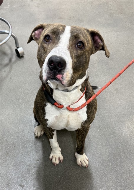 I am an unaltered male, brindle Pit Bull Terrier mix.