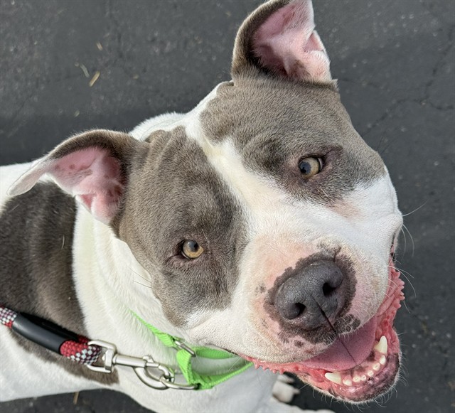I am a spayed female, white and blue Pit Bull Terrier mix.