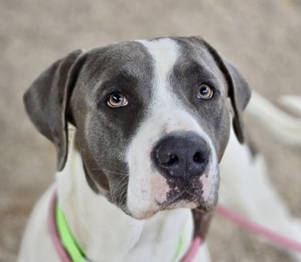 I am a neutered male, white and gray Pit Bull Terrier mix.