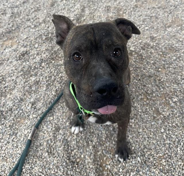 I am a spayed female, brown brindle and white Pit Bull Terrier and Terrier.