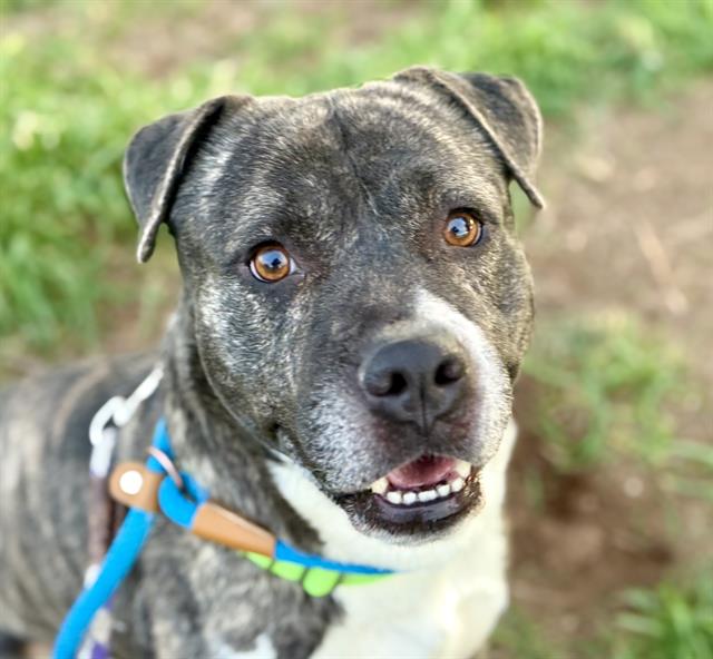 I am a neutered male, brown brindle and white Pit Bull Terrier mix.