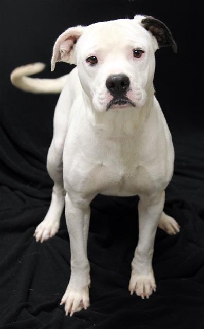 Description: My name is Marley. I am a neutered male, white Bulldog mix.