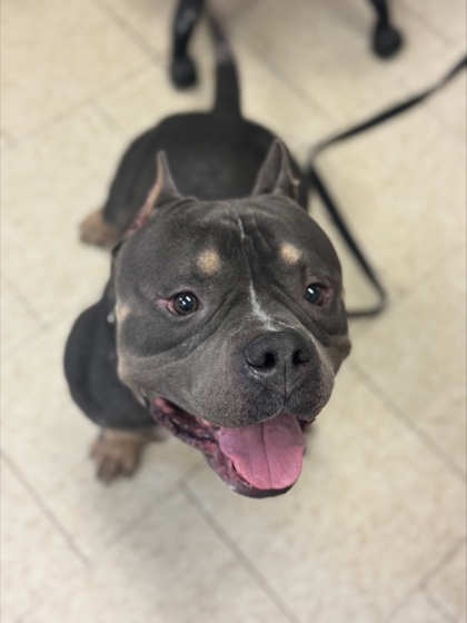 Meet Tex! Tex is a 4.5-year-old American Bulldog with a big heart and an even bigger smile. Recently surrendered by his owner, Tex has been nothing but a gentleman in our care. He offers the sweetest eye contact and enjoys all-over petting, from head to chest to his wiggly rear. He’s playful with toys (especially ropes, balls, and squeakers!) and will happily trade for treats. He’s also reported to know sit, stay, and fetch. During his food test, Tex showed no guarding with his bowl here in the shelter, but his previous home did report guarding bones/chews from people and dogs, so a home with teens, 14+ is recommended. He’s friendly with new people, walks nicely on leash. Tex is a goofy, loving boy who just wants companionship, playtime, and a comfy couch to snooze on. If you’re looking for a sweet, fun, and loyal buddy, Tex might be your guy!