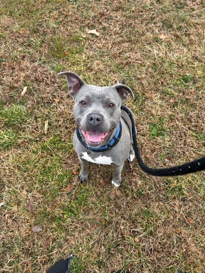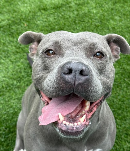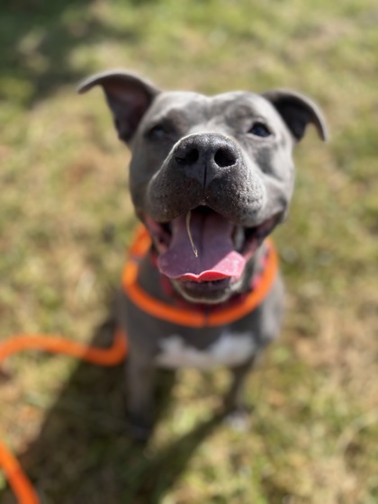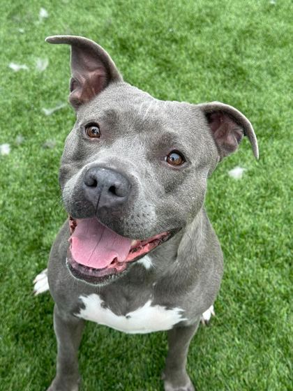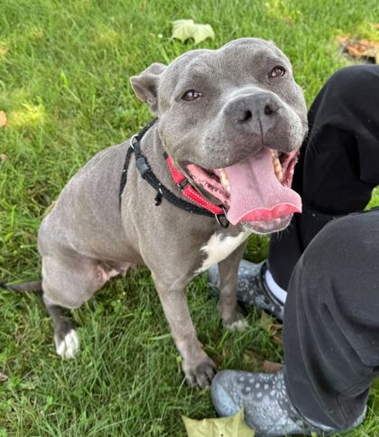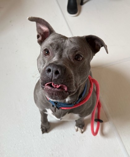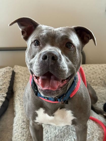 I am a female, blue Pit Bull Terrier mix.