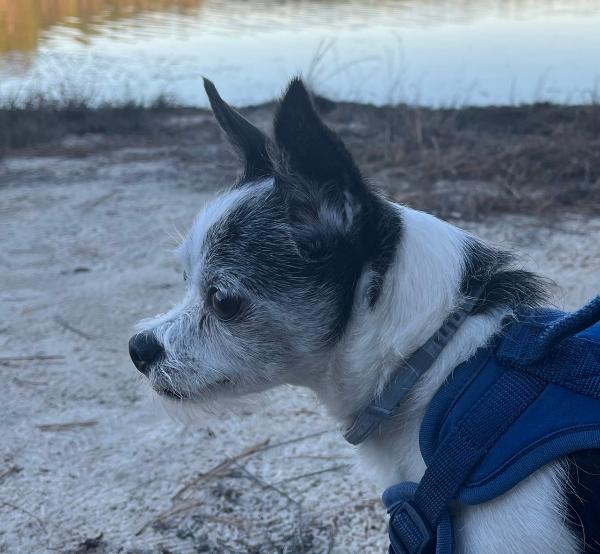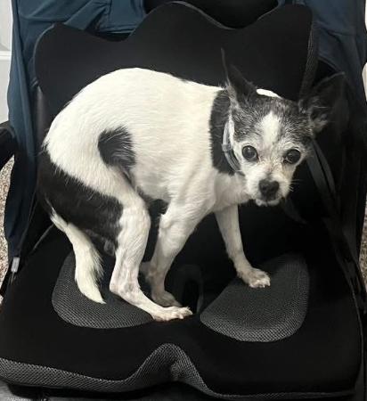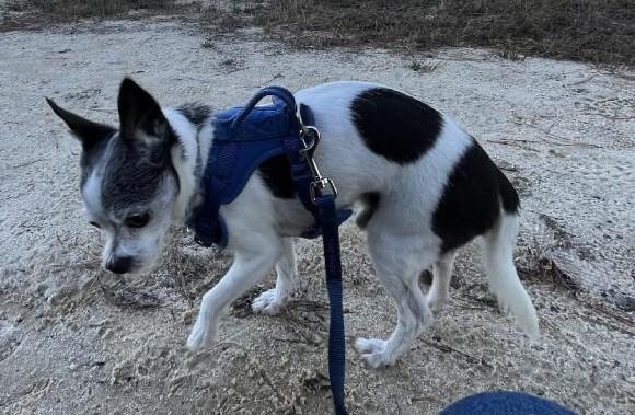 Details: Half Chihuahua/half Unknown mix, brown eyes, white with black spots, last seen wearing gray flea collar. 15 years old, 8 lbs, about 1.5ft long. Quick and spry for 15 years old.