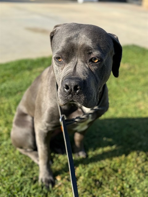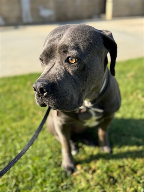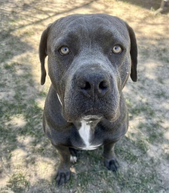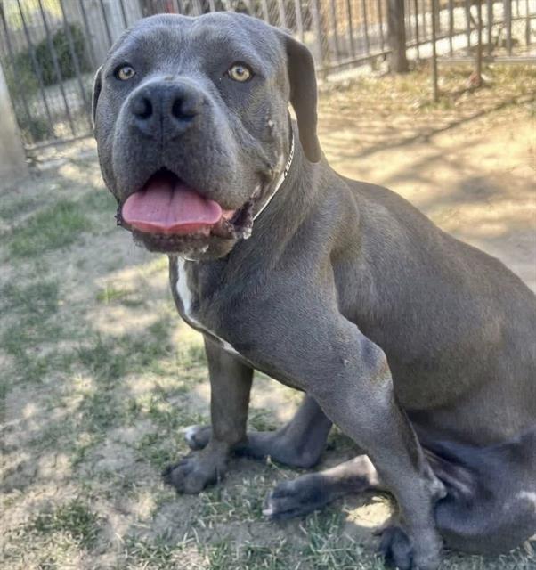 Description: I am a female, 65.60 lbs, gray and white Pit Bull Terrier mix.