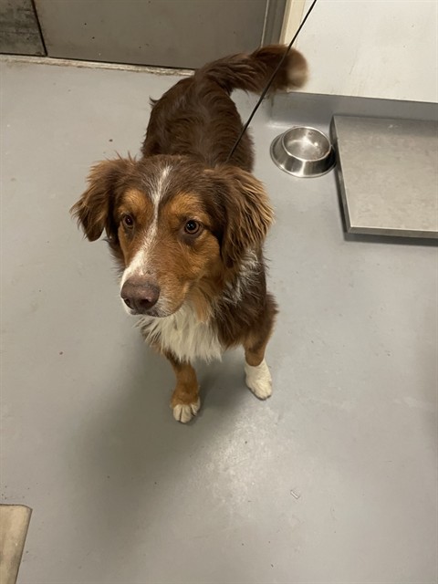 Description: I am a male, 46.80 lbs, brown and white Australian Shepherd mix.