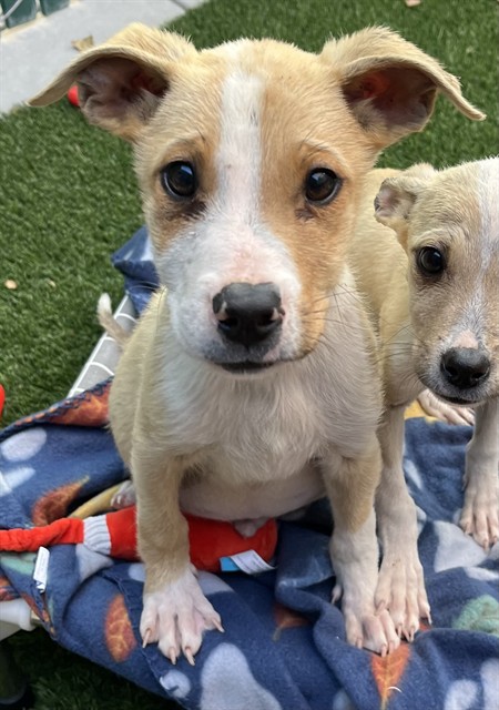 Description: I am a tan and white, neutered male, who looks like a Border Collie mix.