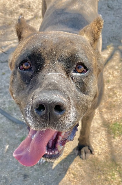 Description: I am a black brindle, unaltered female, who looks like a Cane Corso.