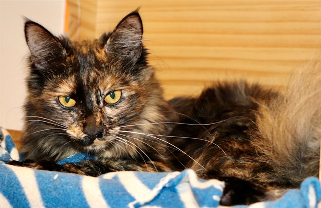Description: My name is Avila and I am a female, tortie Domestic Longhair.