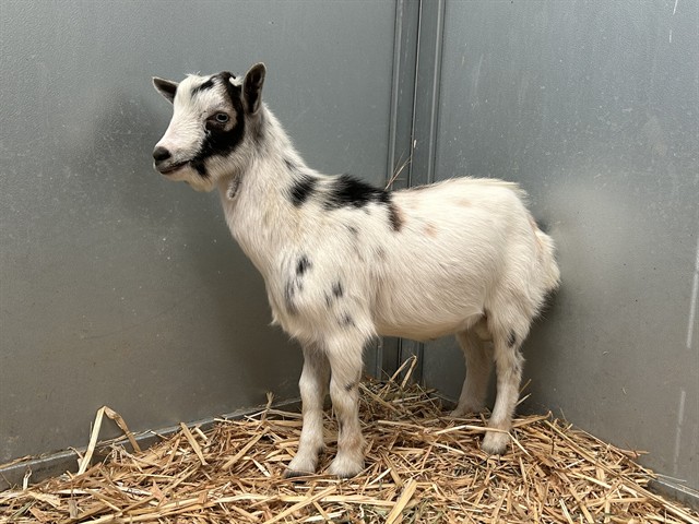 Description: My name is Buzz and I am a male, white and gray Goat.