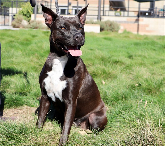 Description: My name is Judy and I am a female, black and white Pit Bull Terrier mix.