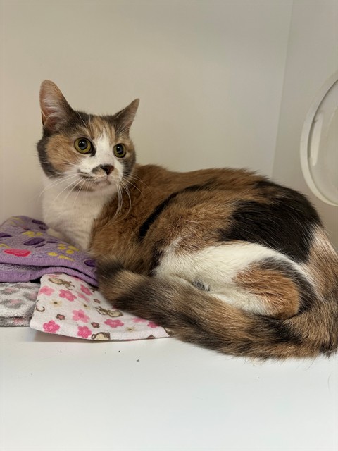 Description: My name is Maggie and I am a female, calico Domestic Shorthair.