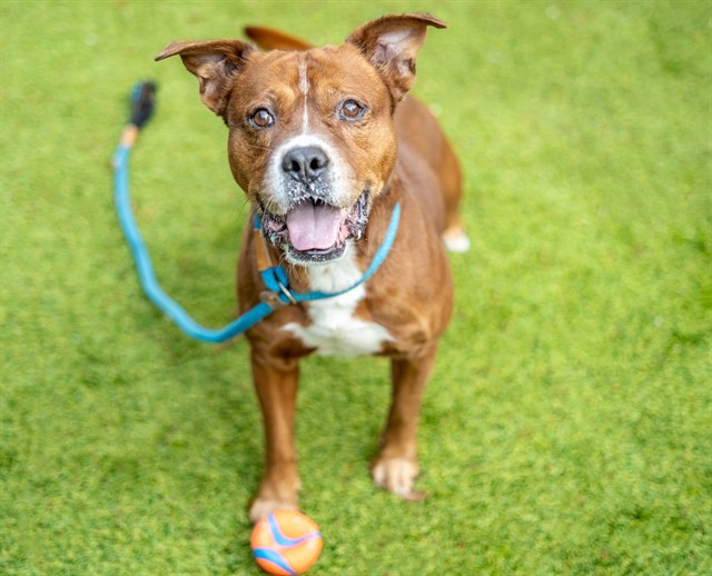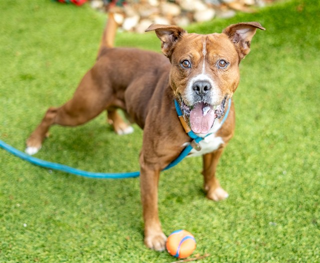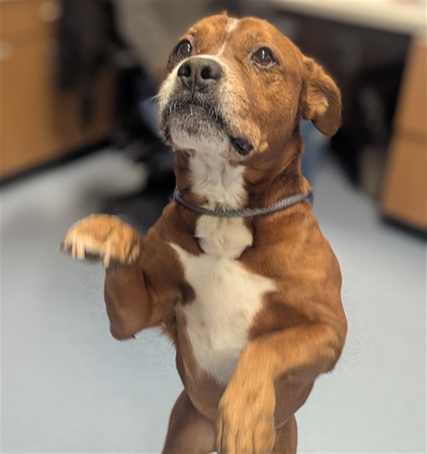 On walks and in the yard, he’s curious about other dogs and may pull to say hello, but he keeps his cool with no barking or lunging. He enjoys gentle petting, seeks attention, and is considered easy to manage overall. While he’s not currently in a playgroup, he’s thought to be a good candidate for a gentle, dainty play style. If you’re looking for an affectionate, playful companion who’s always ready to toss the ball, this might be your match!