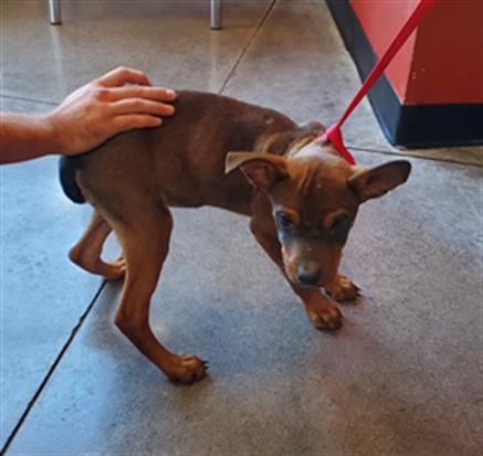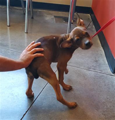 Description: I am a male, brown and tan Doberman Pinscher mix.