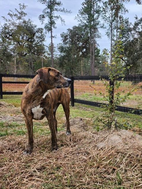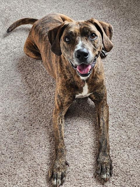 Description: I am a neutered male, brown brindle and white dog.