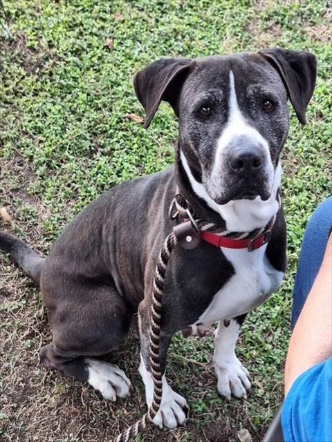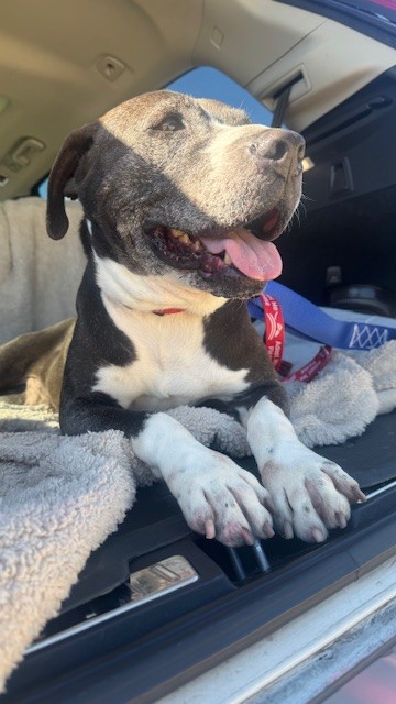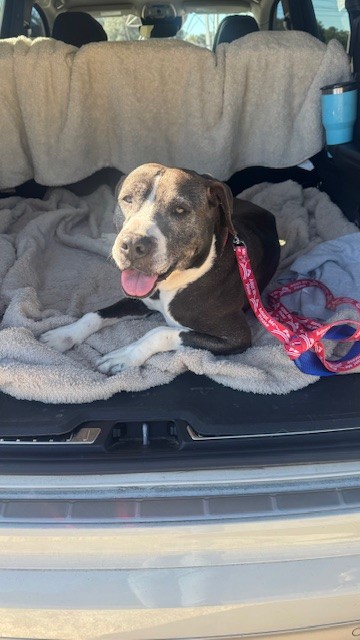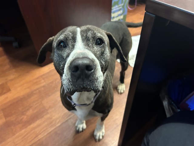 Description: I am a spayed female, gray and white dog.
