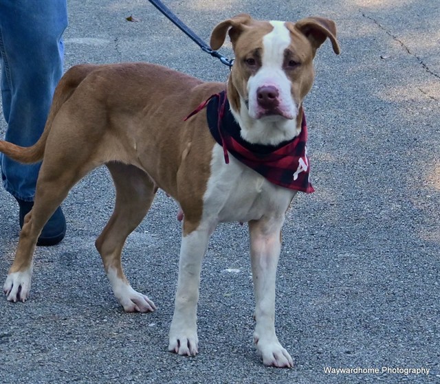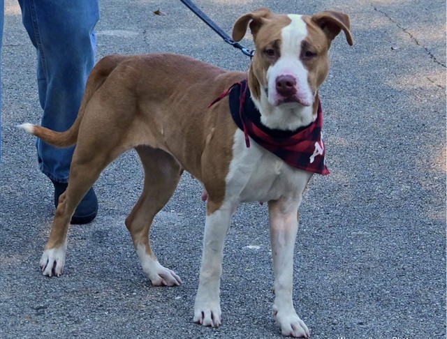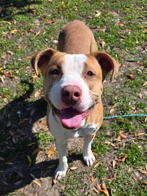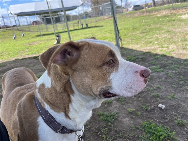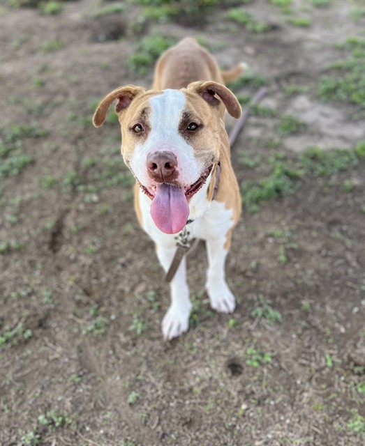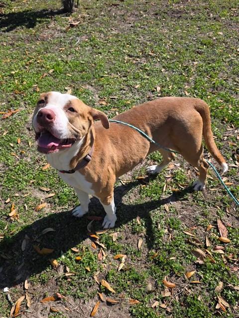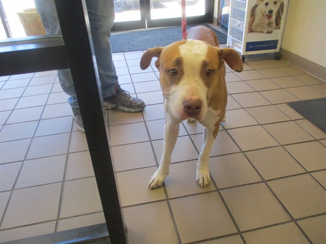 Description: I am a spayed female, tan and white dog.
