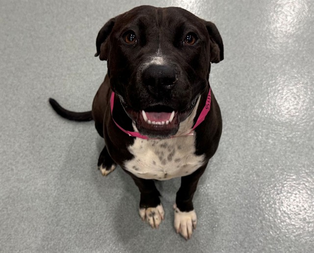 Description: My name is Cindy and I am a female, black and white Pit Bull Terrier mix.