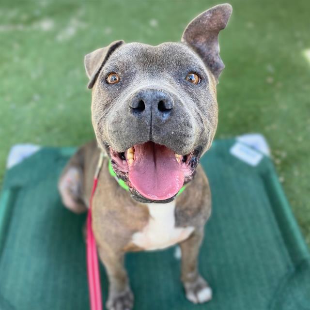I am a neutered male, blue and brown brindle Pit Bull Terrier.
