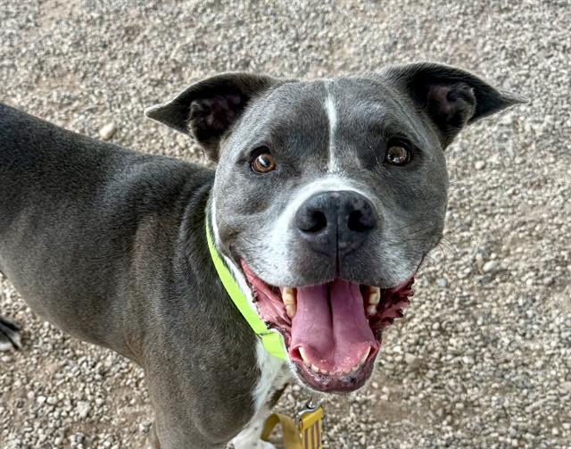 I am a neutered male, blue and brown Staffordshire Bull Terrier.