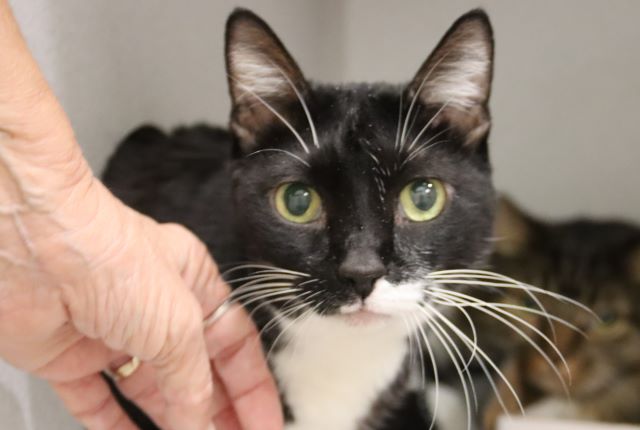 I am a spayed female, black and white Domestic Shorthair.