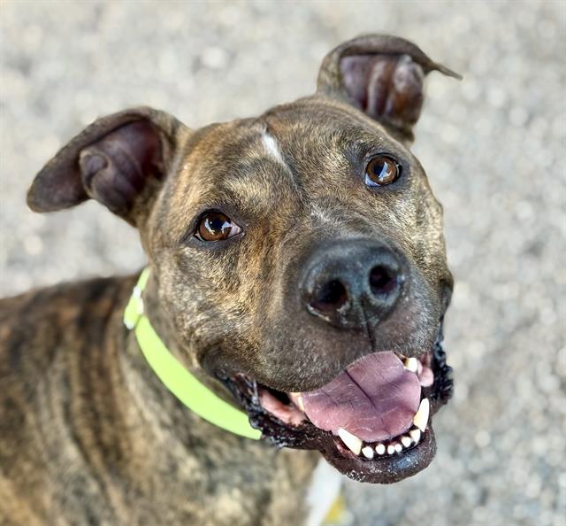 I am a neutered male, brown brindle Pit Bull Terrier mix.