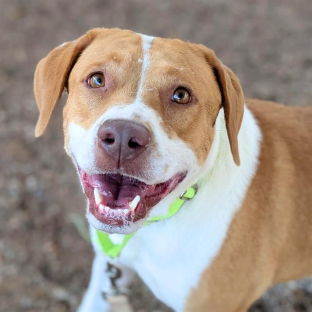 I am a spayed female, tan and white Pit Bull Terrier mix.