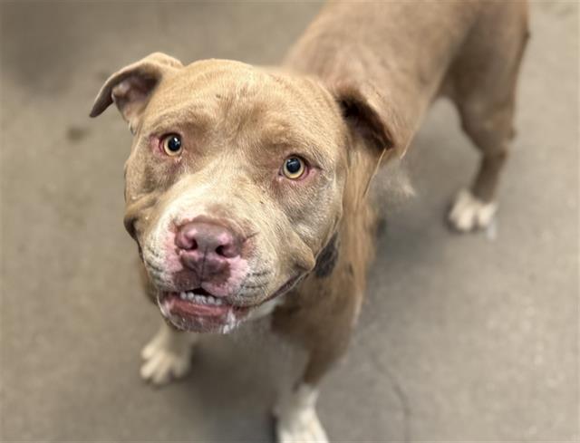 I am a neutered male, fawn and white Pit Bull Terrier mix.